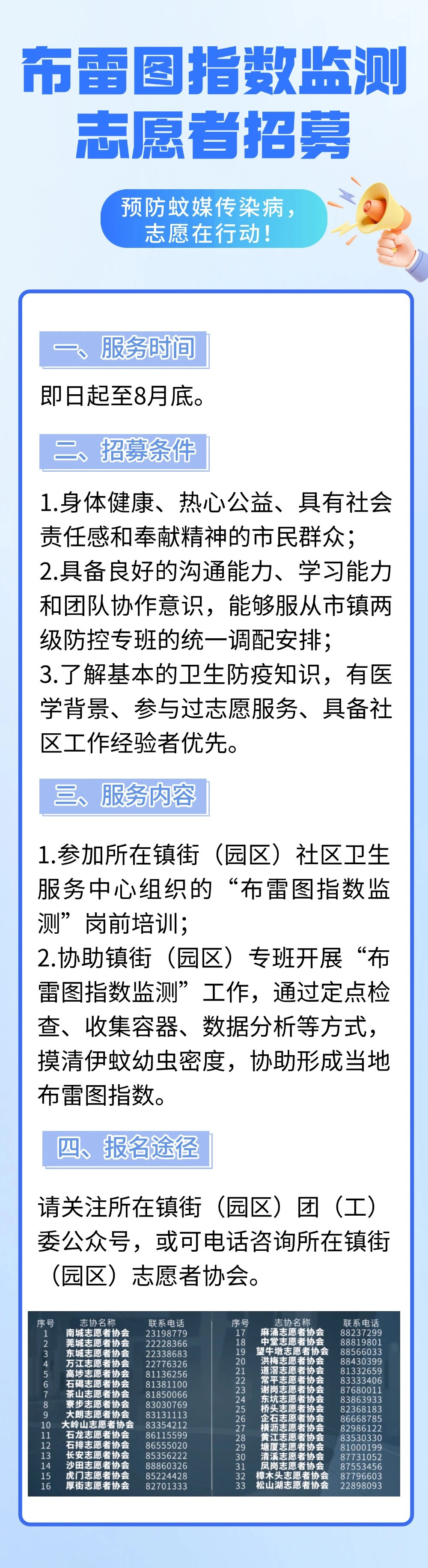 各位市民朋友们如有意向加入布雷图指数监测志愿服务,请联系所在镇街(园区)志愿者协会,为全市蚊媒传染病防控攻坚战贡献一份力量。